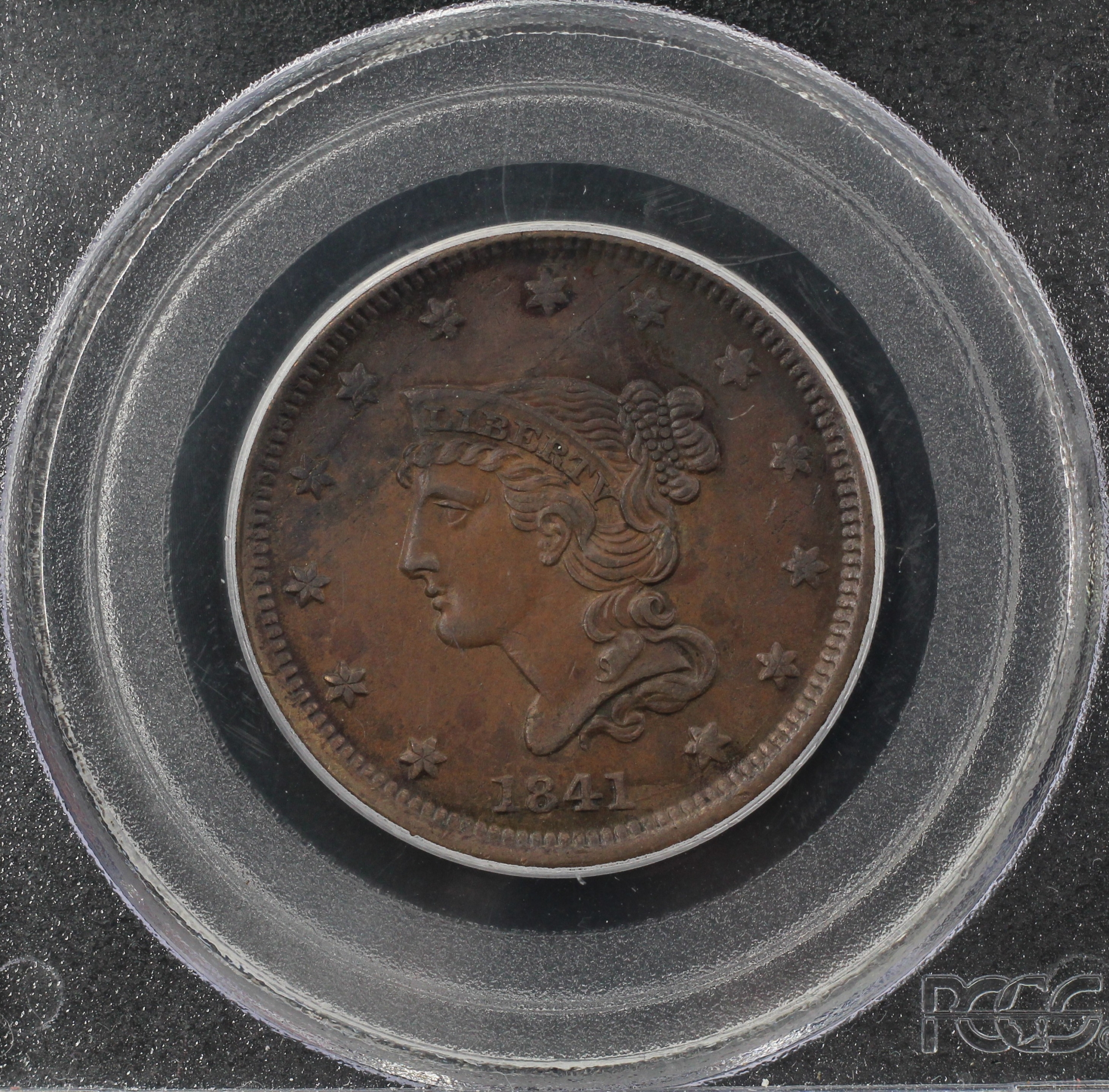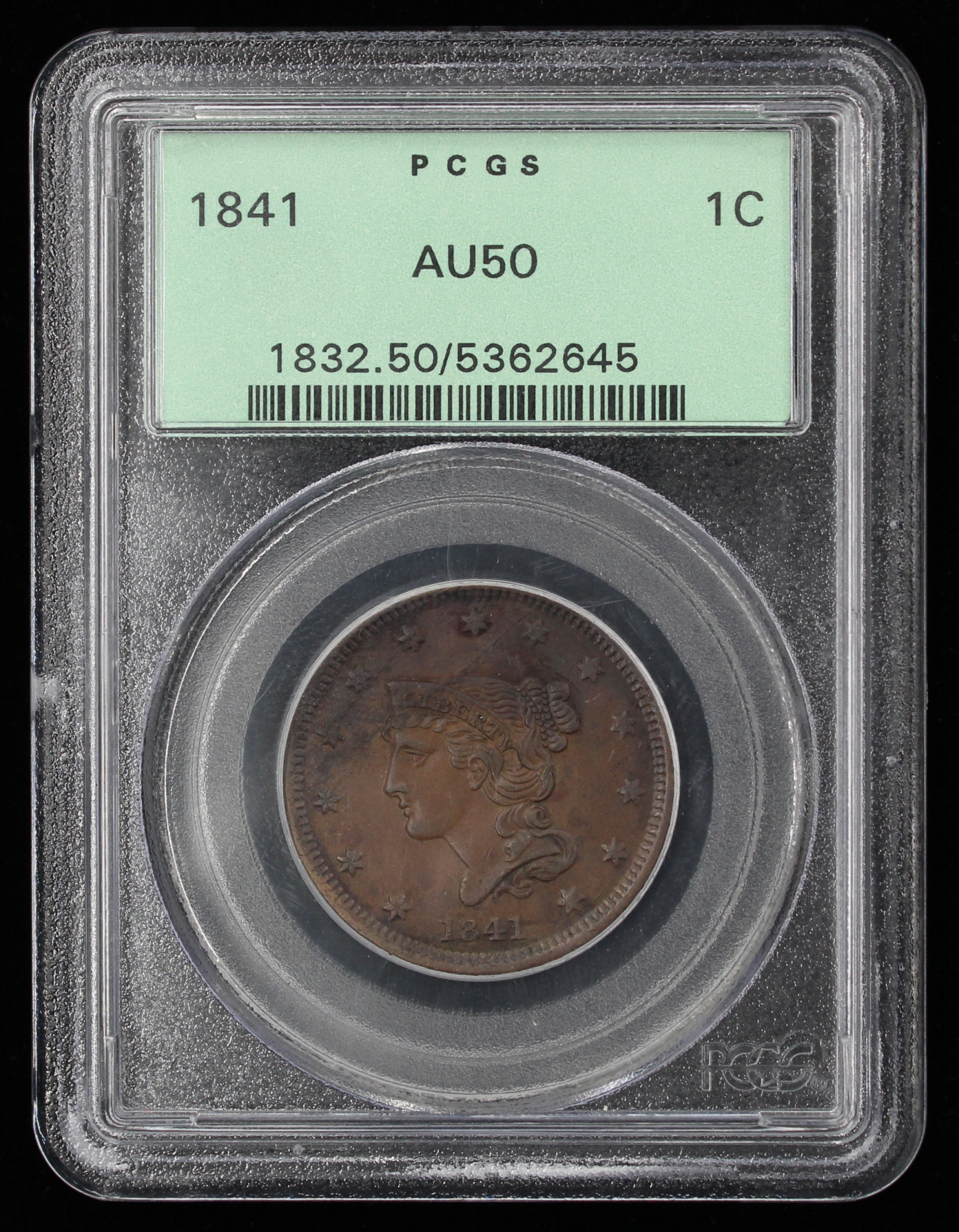 1841 BRAIDED HAIR LARGE CENT 1C PCGS AU50 OGH OLD GREEN HOLDER (PQ058)