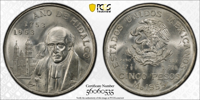 1953-Mo MEXICO 5 PESOS PCGS MS65 – HIDALGO BICENTENNIAL POP 36+18! (60535)