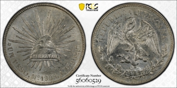 1908-Mo AM MEXICO 1 PESO PCGS AU DETAILS KM-409.2 – CAP & RAYS LIBERTAD (60529)